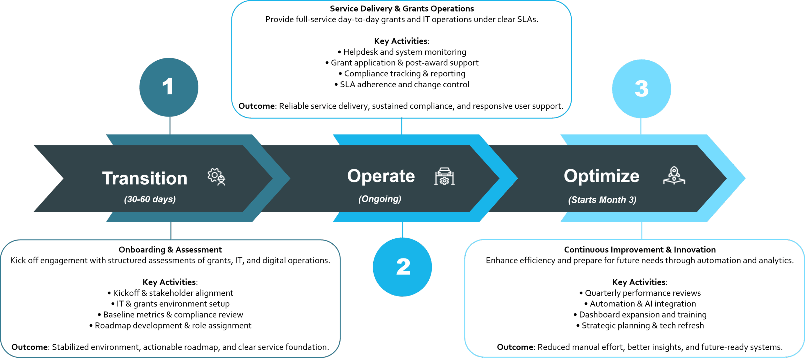 Zenius applies a structured, phased approach to deliver reliable, compliant, and scalable Grants Managed Services. From initial onboarding through daily operations and ongoing optimization, our model ensures every client receives tailored support grounded in strategy, technology, and measurable outcomes.